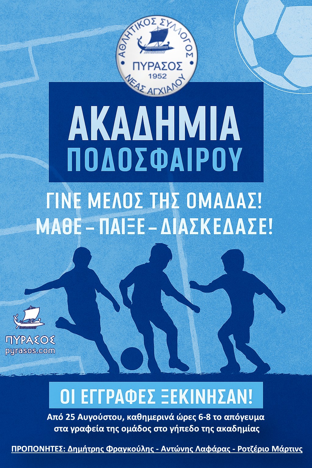 Για ακόμη μία χρονιά, η ακαδημία ποδοσφαίρου του Πυράσου ανοίγει τις πύλες της για να υποδεχθεί τα παιδιά της Νέας Αγχιάλου!