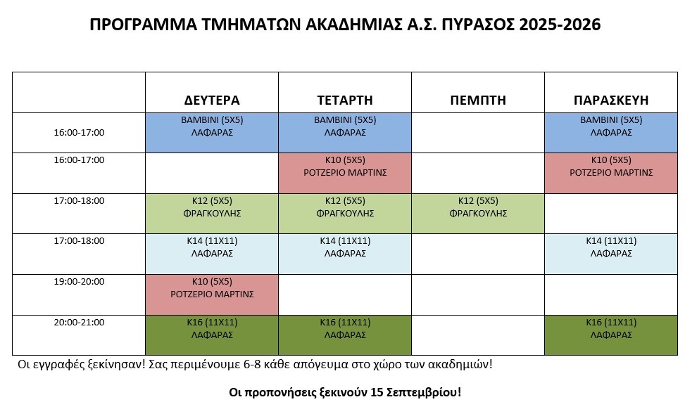 Οι εγγραφές στην ακαδημία του Πυράσου συνεχίζονται καθημερινά και ώρες 6-8μ.μ. στα γραφεία του συλλόγου, στις εγκαταστάσεις της ακαδημίας. Ανακοινώνεται πως οι προπονήσεις ξεκινούν την Δευτέρα 15 Σεπτεμβρίου και το πρόγραμμα προπονήσεων έχει ως ακολούθως (κάντε κλικ πάνω στην εικόνα για να την δείτε σε μεγαλύτερο μέγεθος):